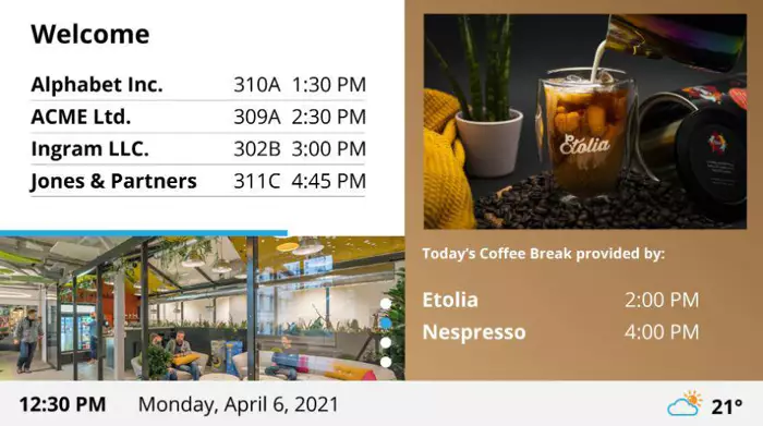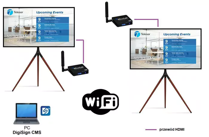 Na przygotowanych wcześniej szablonach łatwo można zmieniać treść komunikatów, plany sal czy harmonogramy aktualnych wydarzeń. Dzięki zastosowaniu odtwarzacza Digital Signage MuxLab 500799 na ekranie odtwarzana jest treść w rozdzielczości 4K i odświeżaniu 60 klatek na sekundę co zapewnia doskonałą jakość obrazu, nawet z bliskiej odległości. Połączenie odtwarzacza z siecią odbywa się przez wbudowany moduł Wi-Fi a ekran łatwo można przestawić w inne miejsce zapewniając tylko zasilanie.
