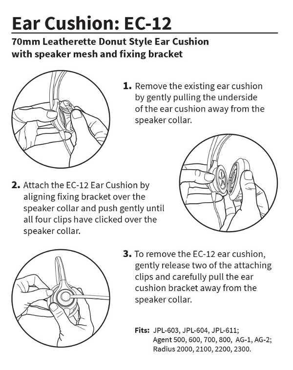 The NEW EC-12 70mm ear cushion fits simply onto our JPL-601, JPL602, JPL-603, JPL-604, JPL-606, JPL-607, JPL-611 and JPL-612 headsets, surrounding your ear with the large cushion to allow you to concentrate on the call and not be distracted by conversations around you. Once you have removed the existing ear cushion, the NEW EC-12 70mm ear cushion simply clips onto the speaker holder.